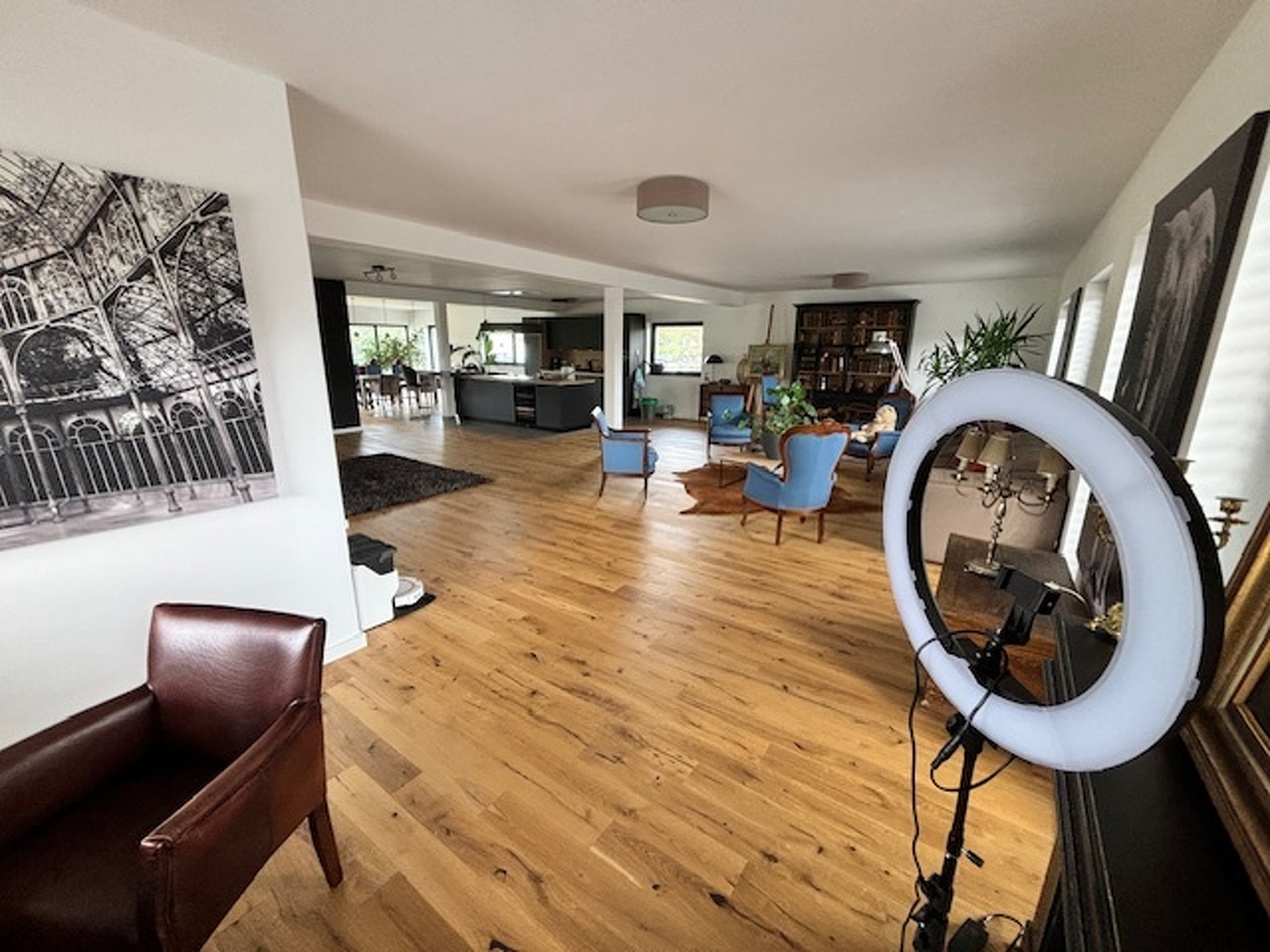 Grand living lumineux avec cuisine ouverte équipée