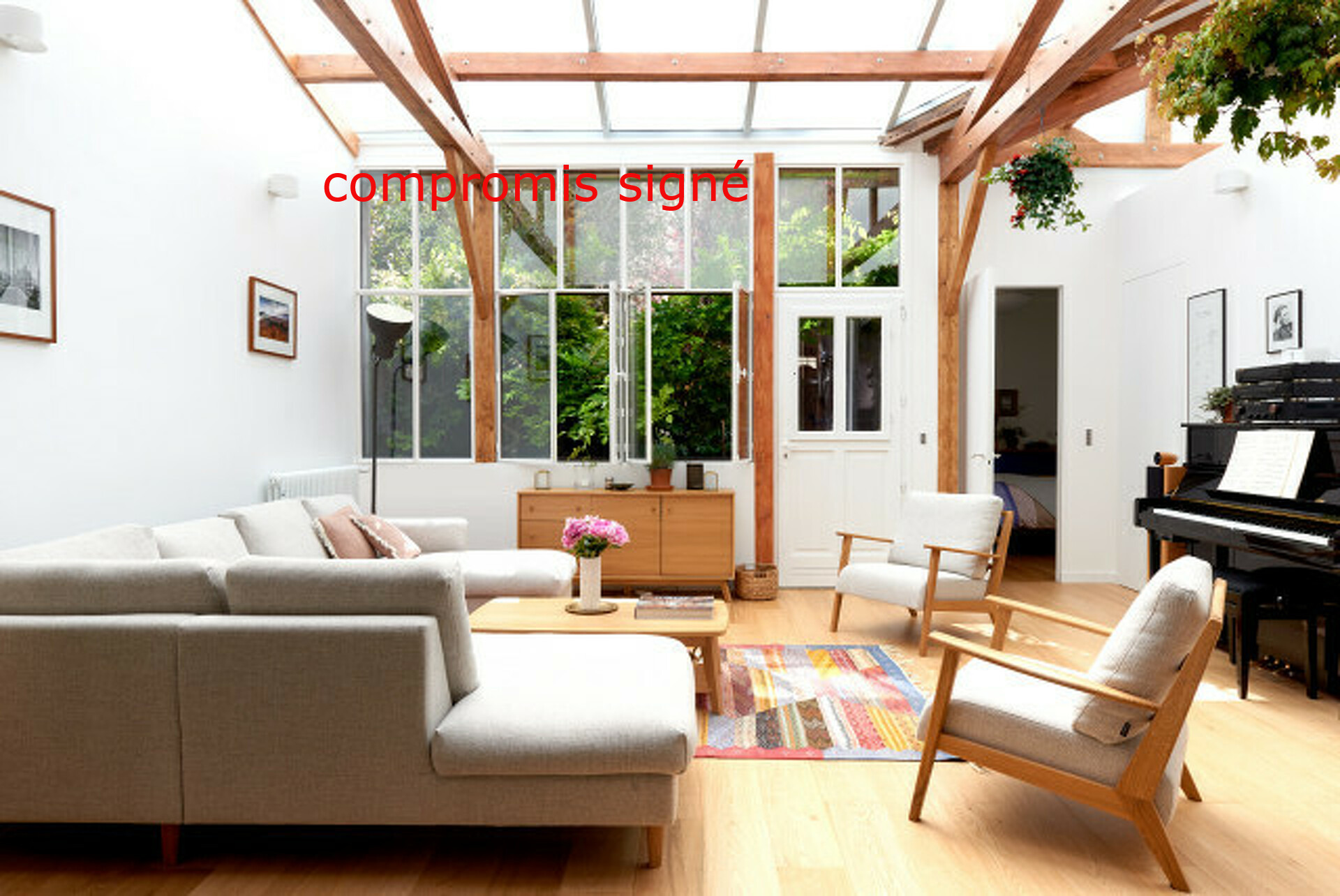 Grand salon-séjour baigné de lumière, avec accès direct à la terrasse et au jardin arboré
