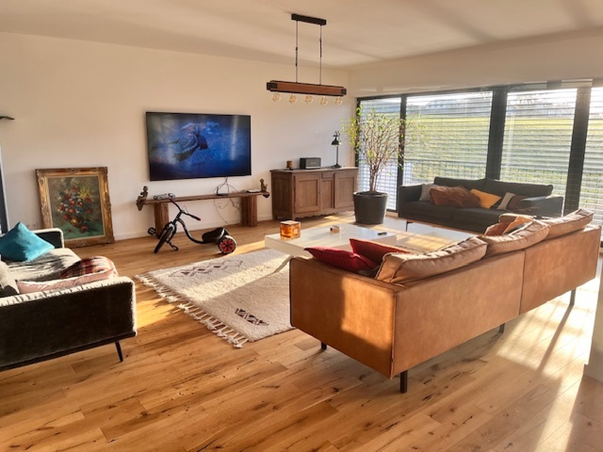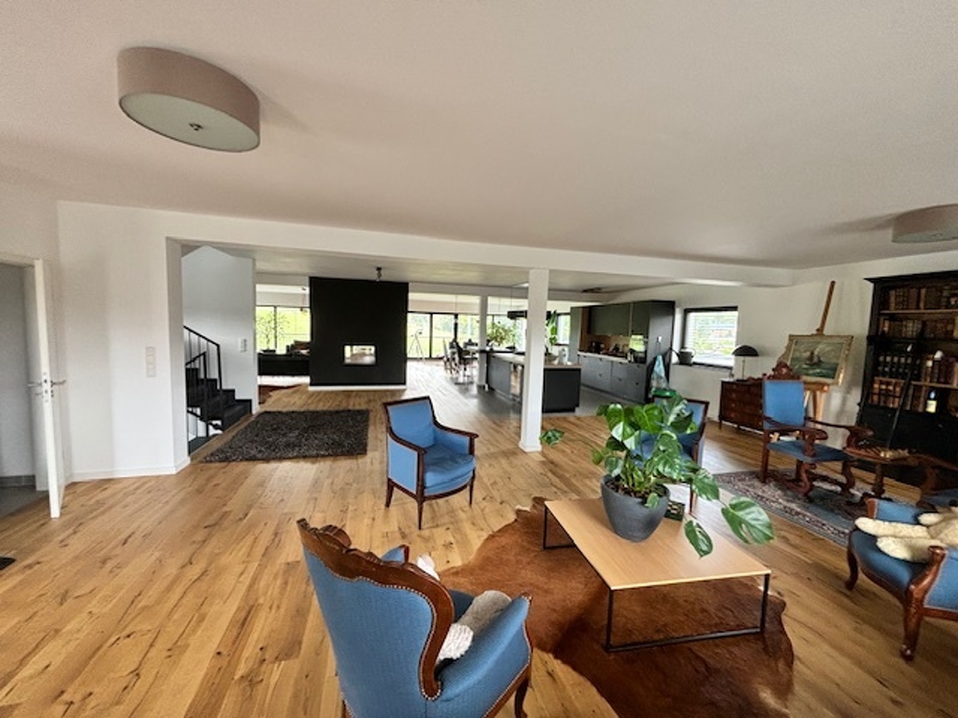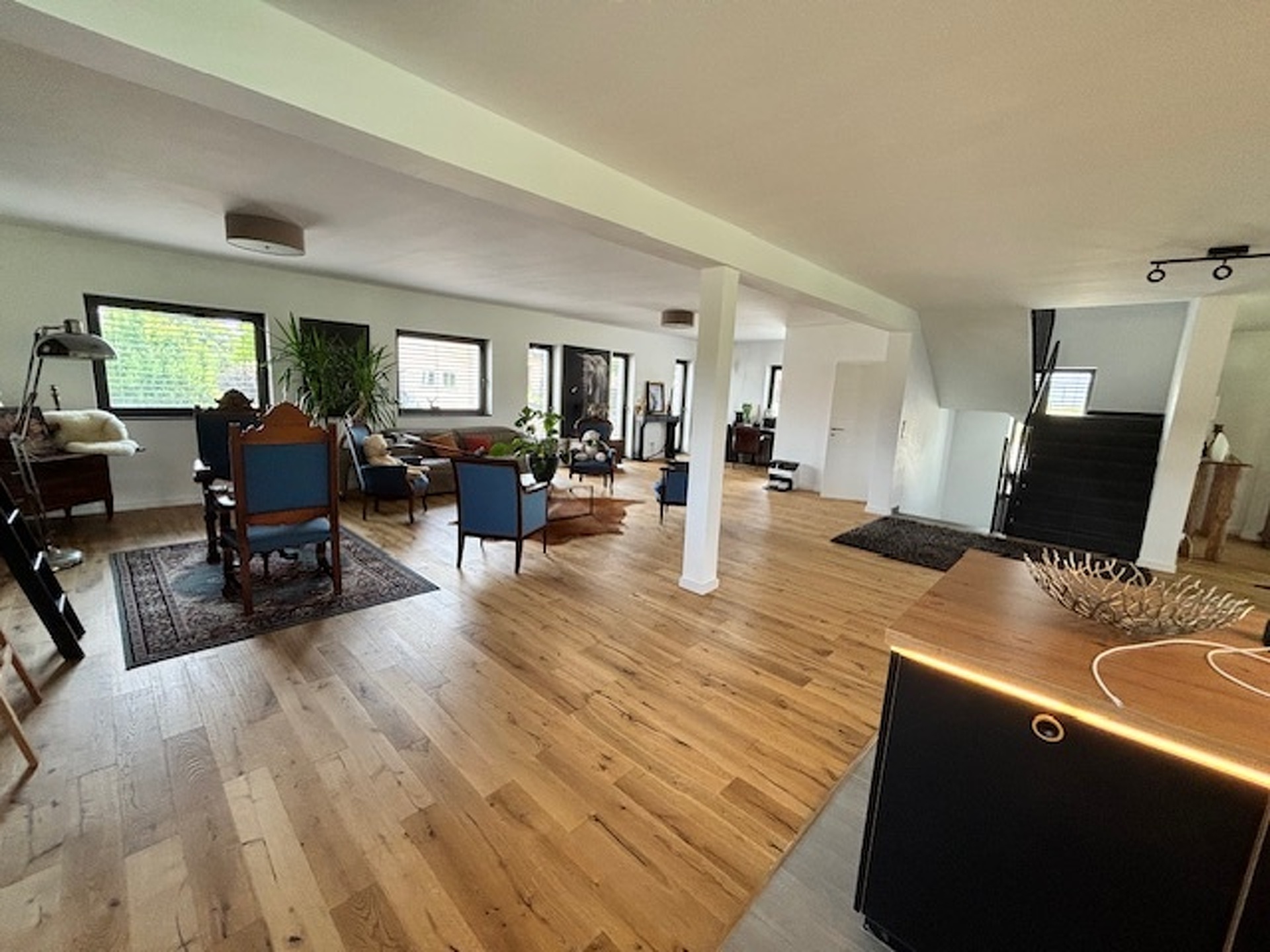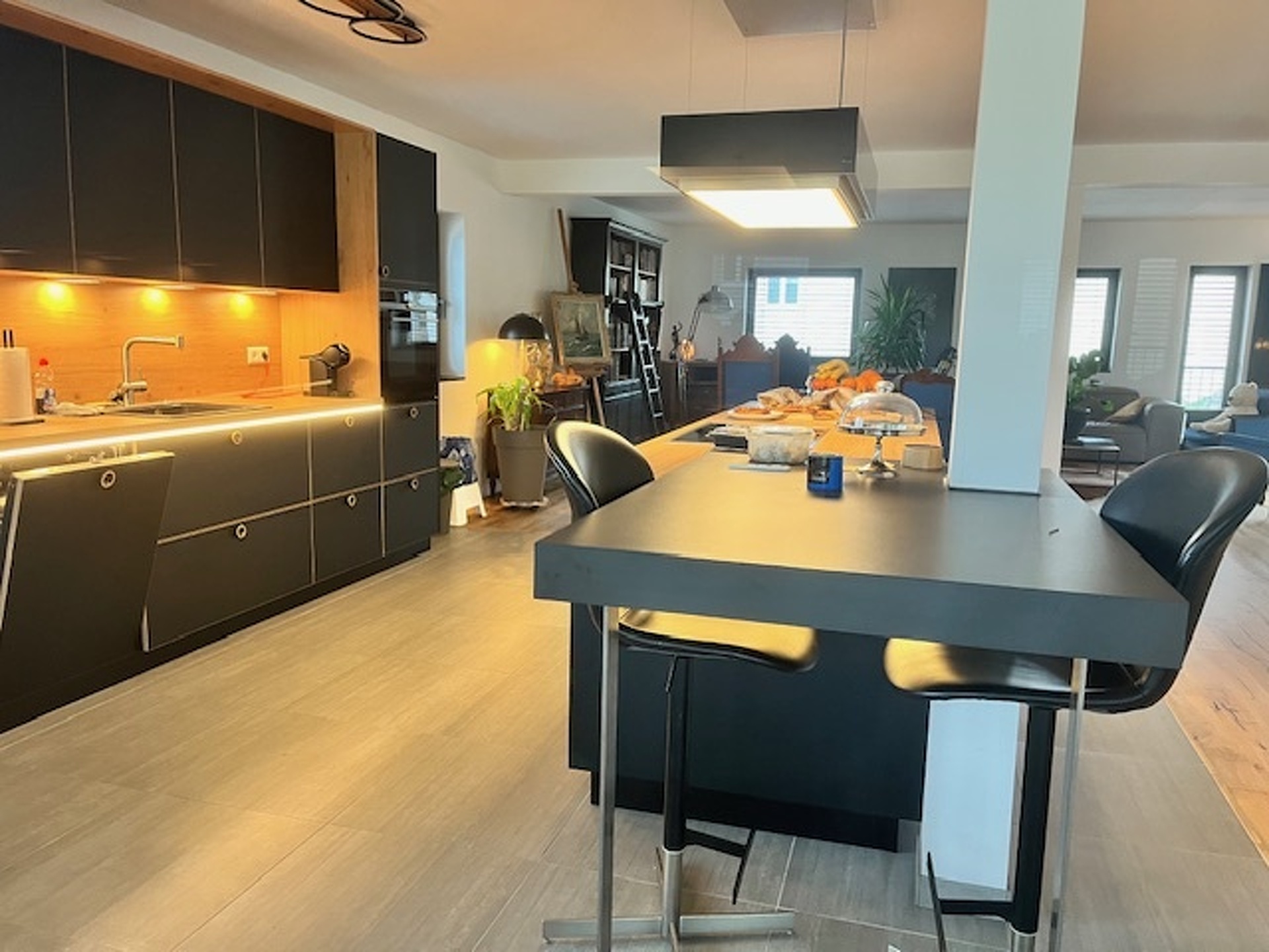 Grand living lumineux avec cuisine ouverte équipée