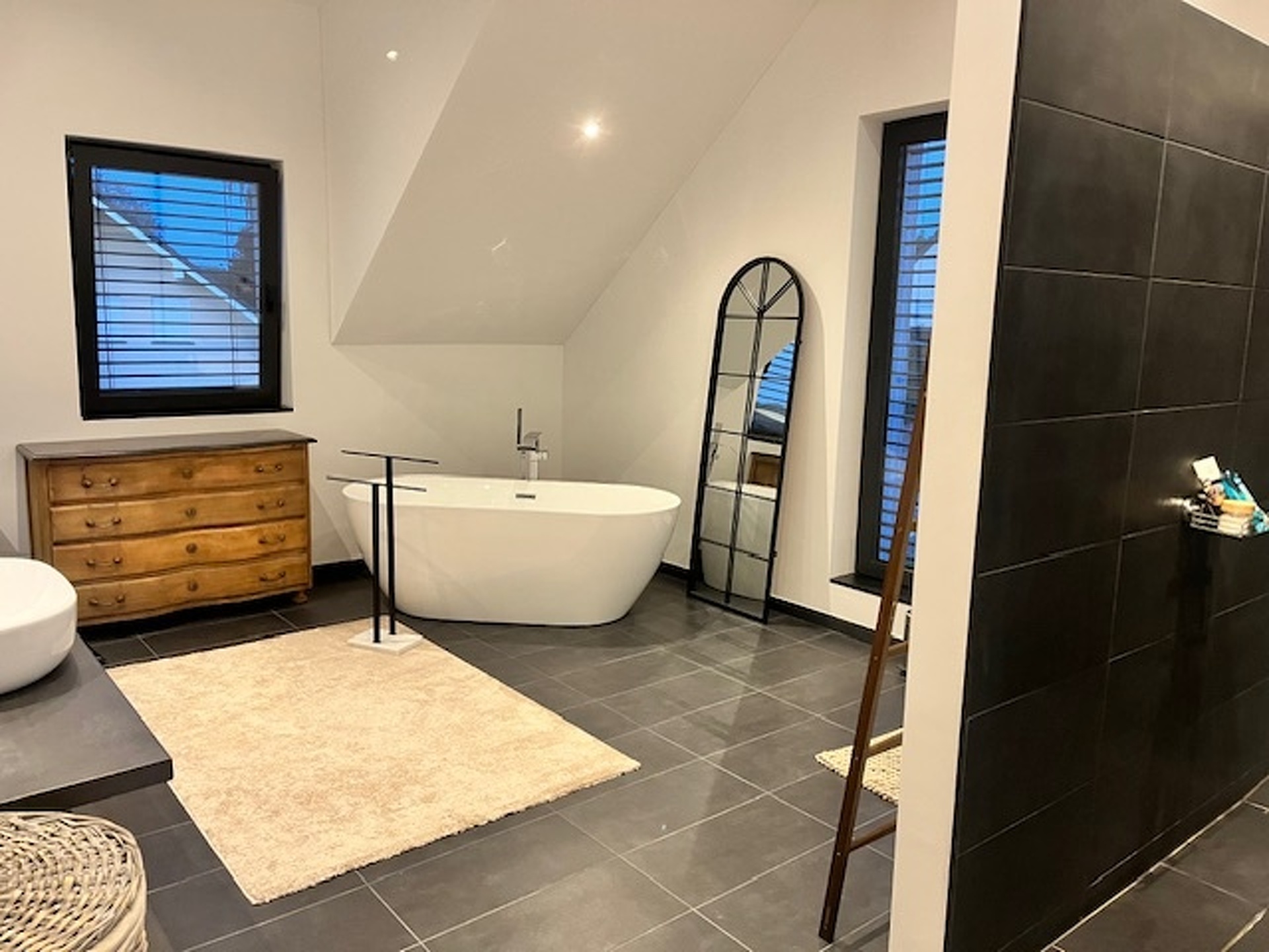 1 grande salle de bain (25 m²) avec baignoire, douche italienne, double vasque et WC
